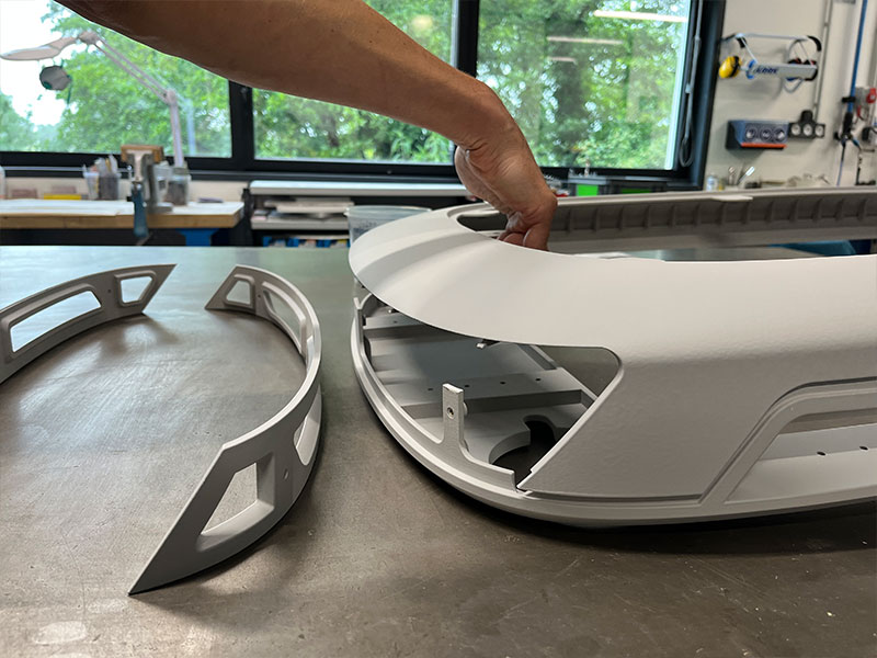 L’objectif est de transformer l’intention en un jeu de pièces d’habillage parfaitement défini : modélisations CAO des pièces extérieures, prise en compte les éléments de fixations sur le châssis technique, création des éléments graphiques et identitaires à positionner, choix des couleurs et des finitions.