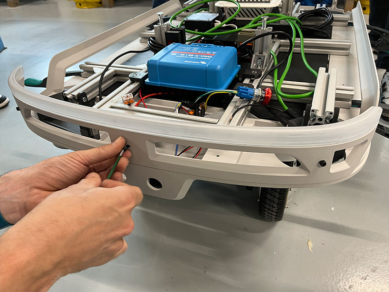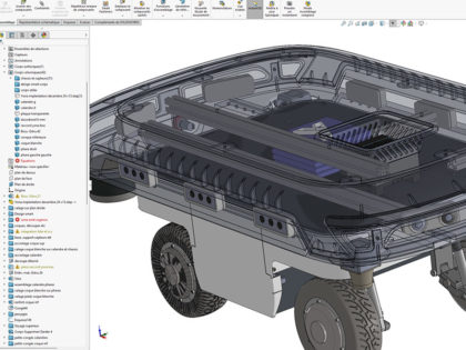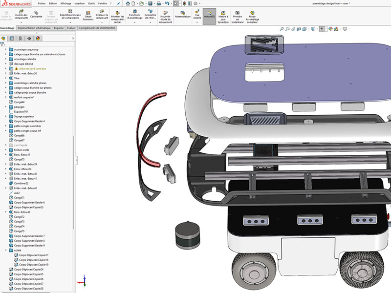 L’objectif est de transformer l’intention en un jeu de pièces d’habillage parfaitement défini : modélisations CAO des pièces extérieures, prise en compte les éléments de fixations sur le châssis technique, création des éléments graphiques et identitaires à positionner, choix des couleurs et des finitions.